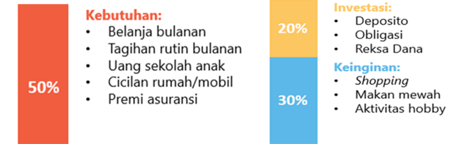 - 50% dari pendapatan kita untuk kebutuhan utama seperti tagihan rutin listrik & air, biaya belanja bulanan, membayar cicilan kredit, hingga asuransi.