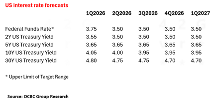 OCBC Group Research maintains its base case for one 25bps fed funds rate cut in 2026 and has pencilled in this expected cut for 1Q26. Thereafter, any additional fed funds rate cuts will probably require inflation to move nearer to Fed’s 2% target.
