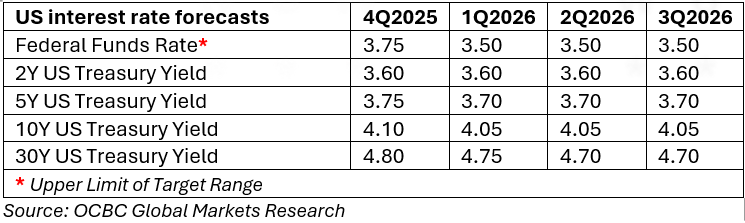 The Fed lowered the target range for the Fed funds rate by 25bps to 3.75-4.00% at its October meeting, in line with expectation. Our base-case remains for a 25 basis points (bps) cut in the Fed funds rate in December and a 25bps cut in 1Q2026. The risk to our base-case is a delay to the expected December rate cut to 2026. Thereafter, any additional cut will probably require inflation moves near the Fed’s 2% target.