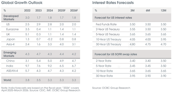 OCBC Group Research mempertahankan skenario dasarnya (base case) untuk satu kali pemangkasan suku bunga dana federal sebesar 25bp pada kuartal pertama 2026. Pemangkasan selanjutnya akan bergantung pada pergerakan inflasi, jika mendekati target Fed sebesar 2%.